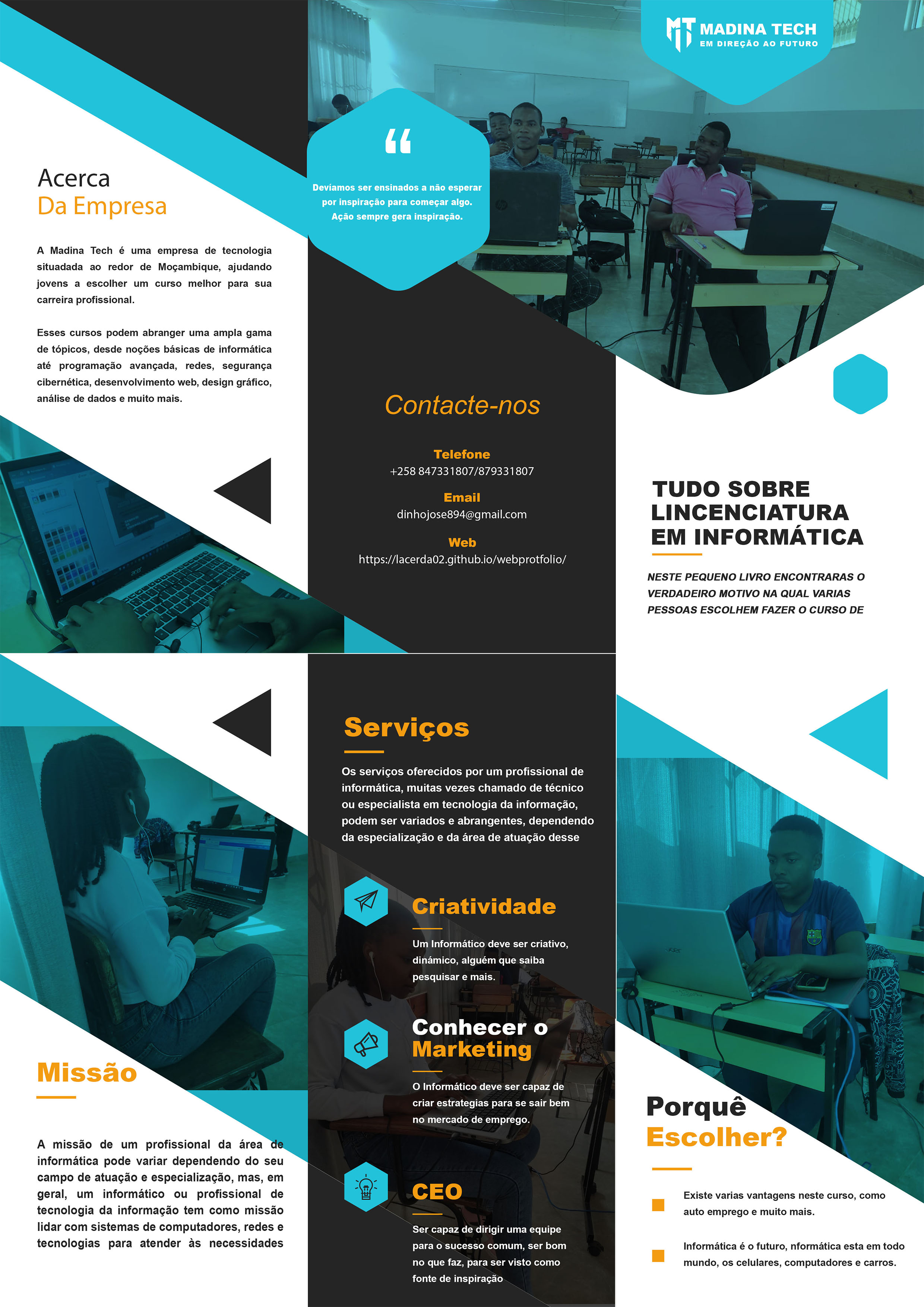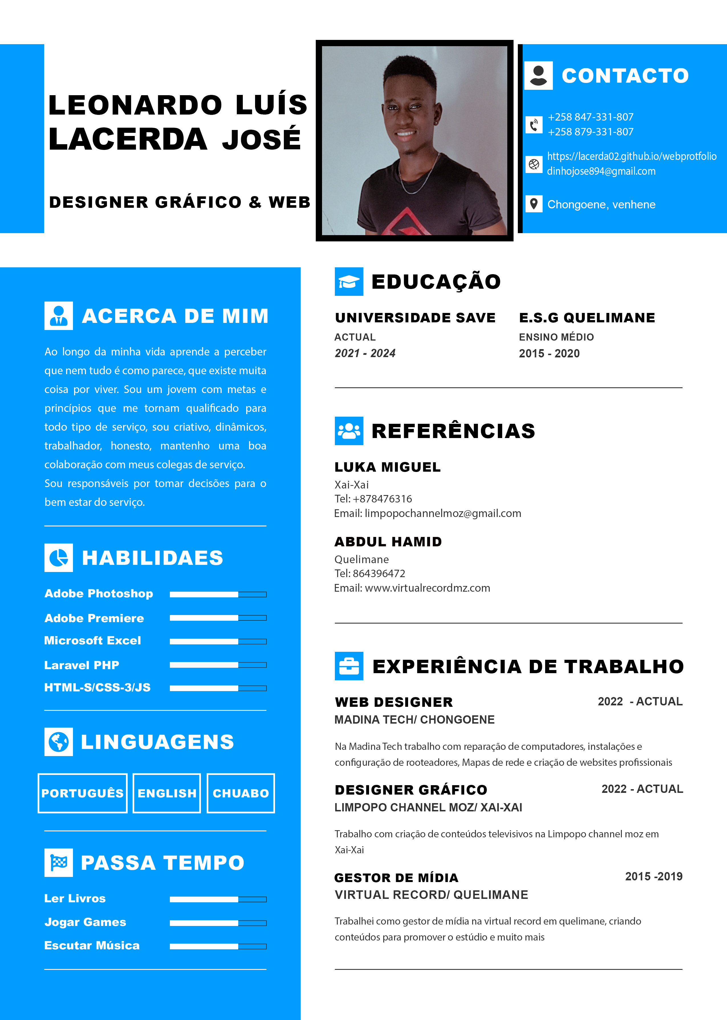 HTML 60%Sou Finalista no curso de Licenciatura em Informática na Universidade Save; Sou flexível, determinado, assíduo, fiel, trabalho em equipe para dinamizar o trabalho.
